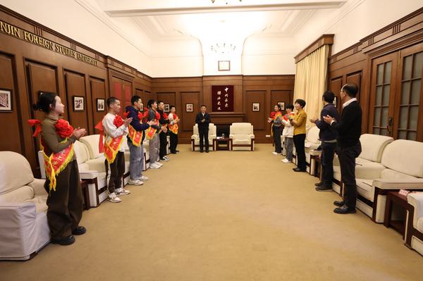 陈法春代表学校向入伍学生及其家人致以崇高敬意,祝贺同学们在圆梦的道路上更近一步。他指出,大学生参军是学校落实立德树人根本任务的重要举措,体现了学生坚定的理想信念和深厚的家国情怀。同学们以实际行动践行了社会主义核心价值观,展现了天外学子崇高的使命感和责任感。他希望同学们在役前集训阶段能够全力以赴,保持好状态,经受住考验,增强抗压能力,全方位提升综合素养,争取顺利入伍,为学校和家人争光;步入军营后,要规划好未来发展方向和成长路径,不放松专业知识的学习。他强调,校内各相关部门要密切配合,全面落实好征兵优抚政策,提供人性化服务保障,协助办理各项手续,做好入伍学子的大后方和补给站。