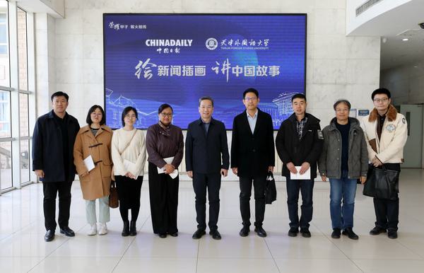 为进一步落实我校与中国日报社国际传播合作协议,加强我校学科建设,拓宽学生国际传播视野,培养学生讲好中国故事、传播中国声音,3月8日下午,中国日报社视觉中心美术室主任编辑宋晨应邀来校,以“绘新闻插图,讲中国故事”为题带来精彩讲座。天津市委宣传部、天津市人民政府外事办公室、中国日报天津记者站相关负责同志受邀出席,副校长余江会见来访客人,校党委宣传部、国际传媒学院相关负责人陪同会见。中国日报、天津日报、今晚报、津云等媒体近30位业内资深记者、编辑,国际传媒学院动画艺术系师生参加讲座。讲座由国际传媒学院党委副书记、院长马兰州主持。