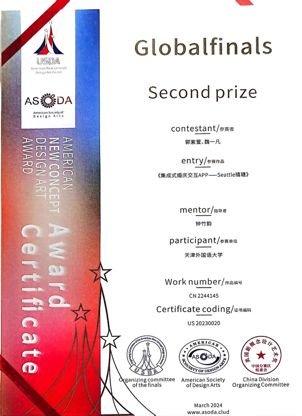 获奖作品《集成式婚庆交互APP------Seattle禧糖》 获奖证书