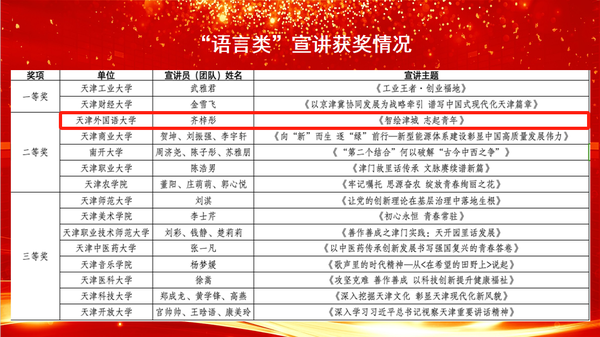为深入学习宣传贯彻习近平总书记视察天津重要讲话精神,全面落实党的二十大精神,引导广大师生用生动鲜活的话语讲好天津故事,凝聚奋进力量,4月12日,由天津市教育两委主办的“牢记嘱托 勇担使命”天津市第二届基层理论宣讲员大赛教育系统分站赛在天津商业大学举行。开云链接官网国际传媒学院辅导员齐梓彤的宣讲作品《智绘津城 志起青年》在语言类宣讲中荣获二等奖;“津门精神勇向前”学生宣讲团的快板表演《讲话精神润津门,津沽大地展新篇》在文艺类宣讲中荣获三等奖。