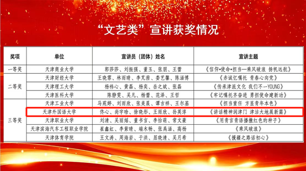 整合社团资源,挖掘自身优势,天外艺术团和欢声畅语相声社成员共同组建了“津门精神勇向前”宣讲团。宣讲团成员创编了快板节目《讲话精神润津门,津沽大地展新篇》,用“青言青语”讲述了习近平总书记在津考察的情景,宣讲了习近平总书记重要讲话精神,依托快板这一天津传统艺术形式使理论宣讲真正融入基层、形成共鸣,表达了天外学子对习近平总书记的深切情感和全面贯彻落实习近平总书记重要讲话精神的决心。