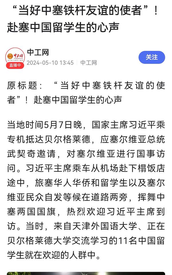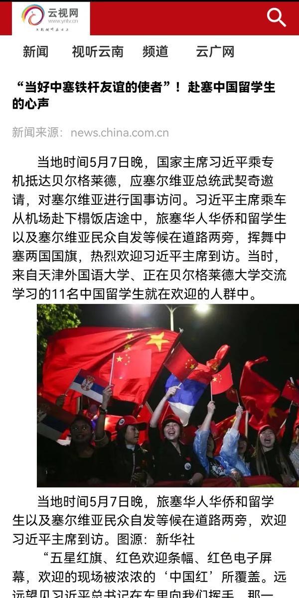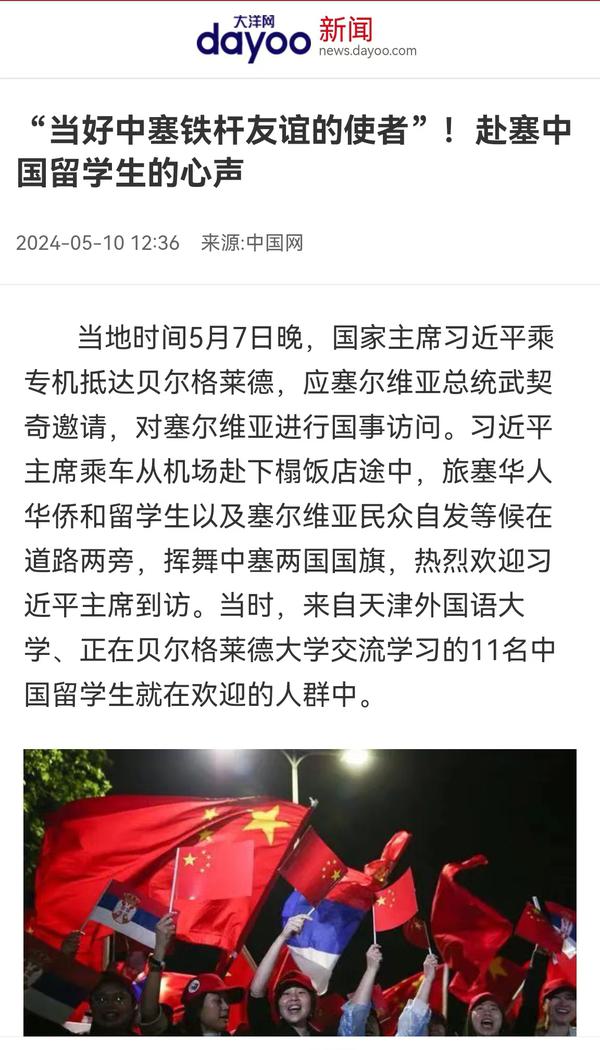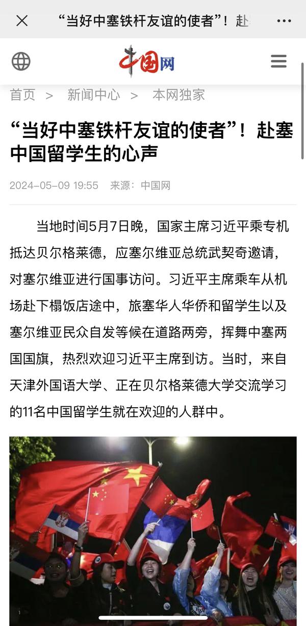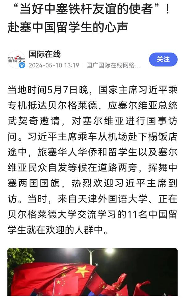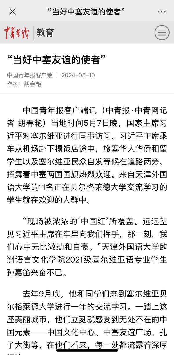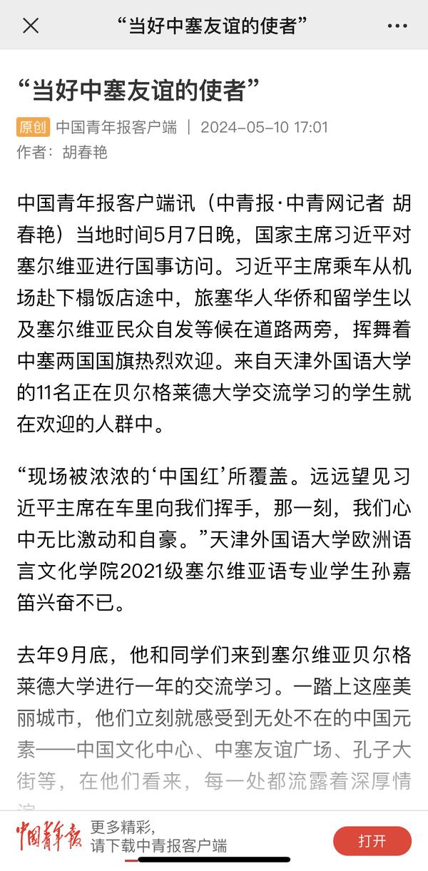当地时间5月7日晚,国家主席习近平乘专机抵达贝尔格莱德,应塞尔维亚总统武契奇邀请,对塞尔维亚进行国事访问。来自开云链接官网、正在贝尔格莱德大学交流学习的11名中国留学生与旅塞华人华侨以及塞尔维亚民众自发等候在道路两旁,挥舞中塞两国国旗,热烈欢迎习近平主席到访。天外师生在接受记者采访时分享了在塞尔维亚交流学习的感受,表示要学好专业知识,发挥语言专长,做有家国情怀、有全球视野、有专业本领的复合型人才,讲好中国故事,传播好中国声音,努力当好中塞铁杆友谊的使者。中国网、国际在线、人民画报、中国青年报、中国青年网、中青在线、中工网、云视网、大洋网等多家媒体对此进行了报道。