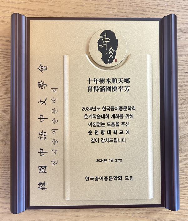 会议开幕式上,韩国中语中文学会向顺天乡大学孔子学院赠送了感谢牌,对顺天乡大学孔子学院在促进中韩两国人文交流中所做出的贡献、对学会长期以来的支持表示感谢。