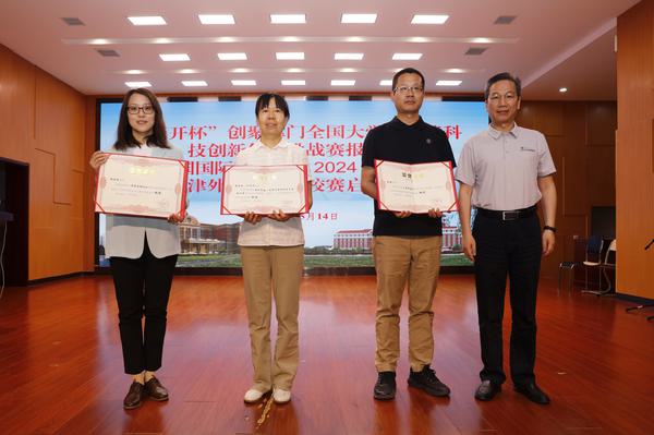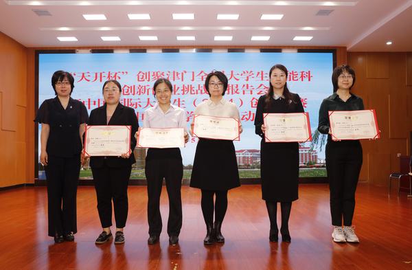 校领导为第九届中国国际大学生创新大赛获得国赛和市赛奖项项目的指导老师颁发了荣誉证书。获奖指导教师代表国际教育学院朱京津作经验分享。