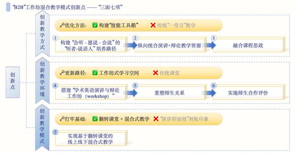 课程注重学生能力培养和意愿提升,将演讲、辩论微技能有机融合,是引领、陪伴、见证学生实际成长的“B2B工作坊(Better-Listener to Better-Speaker Workshop)”,并做出了如下“三面七点”创新: