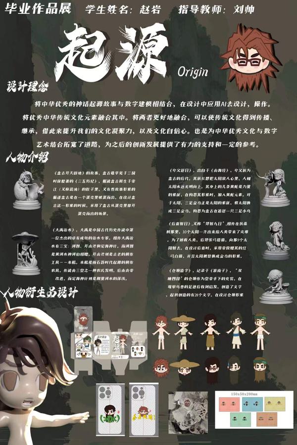 作品简介:作品将中华起源神话故事与数字建模相结合,利用AI技术把中华优秀传统文化元素融合于数字艺术设计中,用AR进行身体交互展示,设计并制作了多样的实体和虚拟周边产品,为中华优秀文化与数字艺术的结合提供了参考。