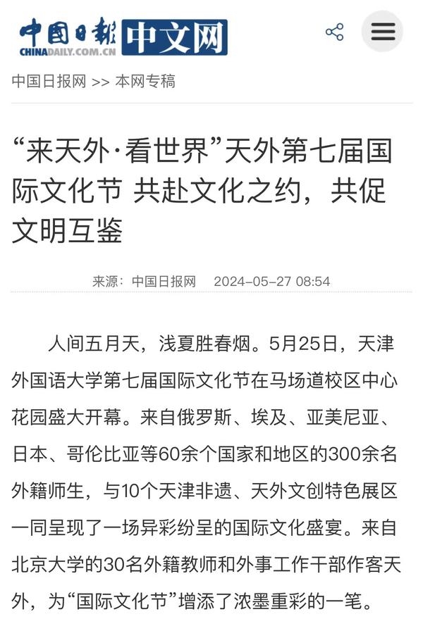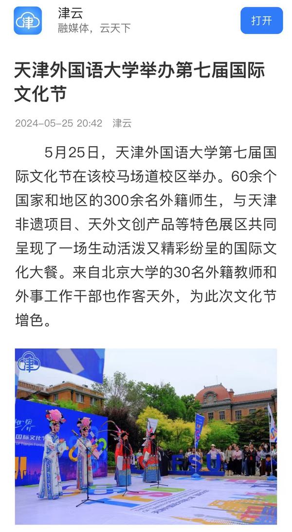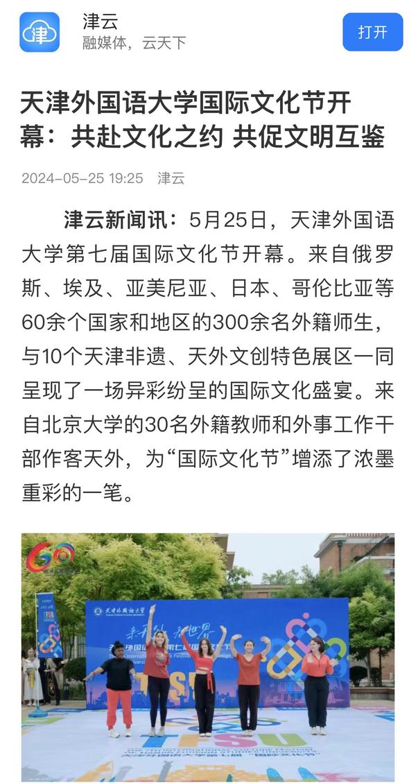 5月25日,开云链接官网第七届国际文化节在该校马场道校区举办。60余个国家和地区的300余名外籍师生,与10个天津非遗项目、天外文创产品等特色展区一同展现不同国家和民族的文化和风情。人民网、中国日报网、央广网、天津广播电视台、天津新闻、天津日报、津云、天津教育报、“你好天津”视频号、网易新闻、天下之津等多家媒体对此进行了报道。
