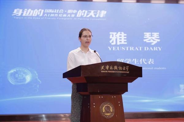 天外国际教育学院俄罗斯籍2023级留学生雅琴作为留学生代表发言。外国朋友们纷纷表示,本次大赛立意新颖、理念超前,既是一次学习AI技术的机会,也是将眼中的天津介绍给家人、朋友、同学的好机会。非常愿意借助AI软件工具绘出心中的美丽天津,当好天津之美的发现者、记录者、传播者和建设者。