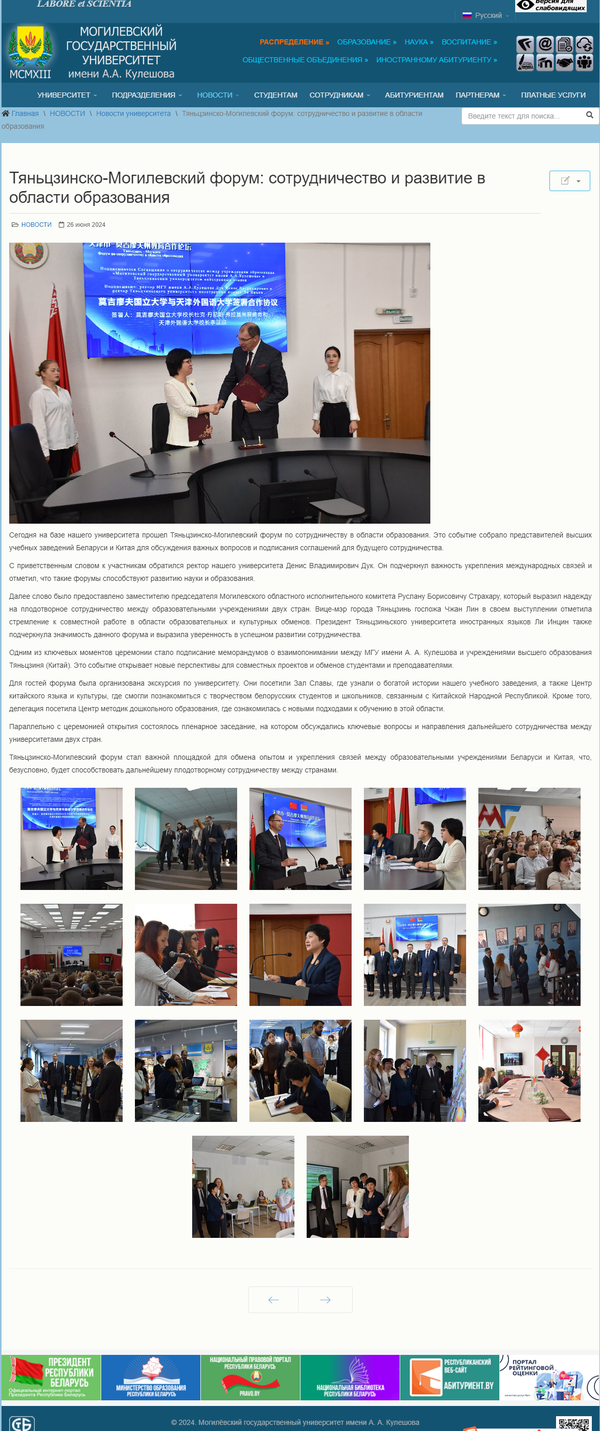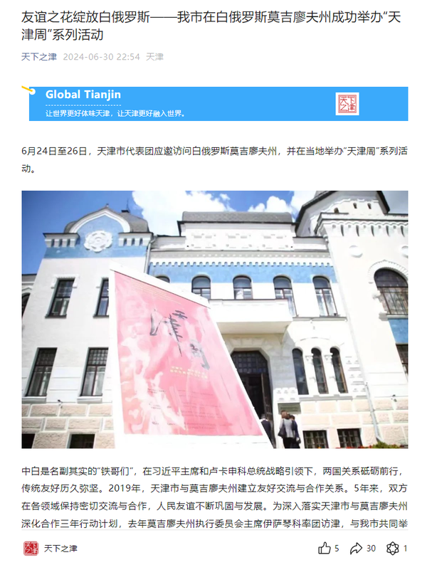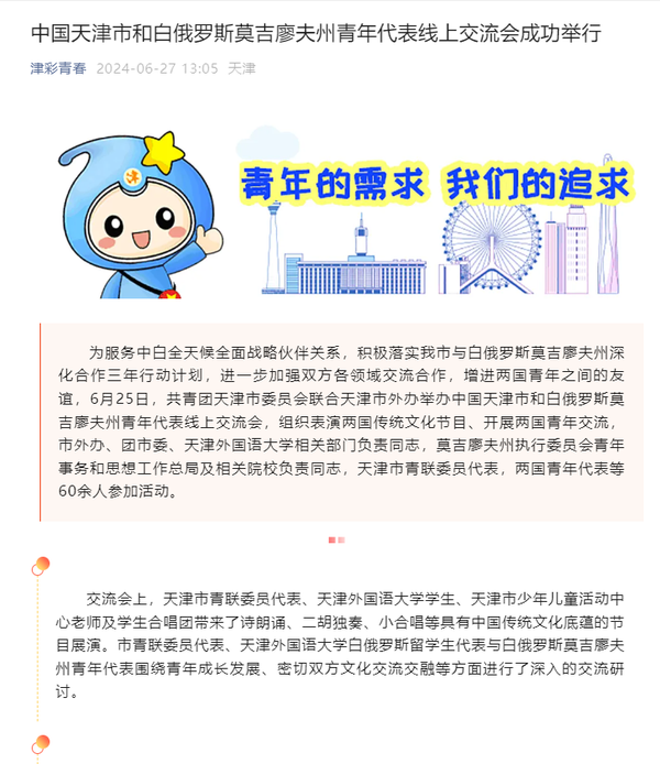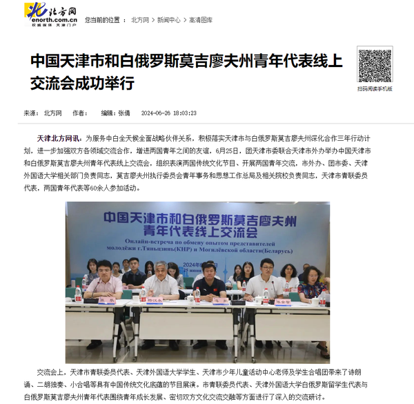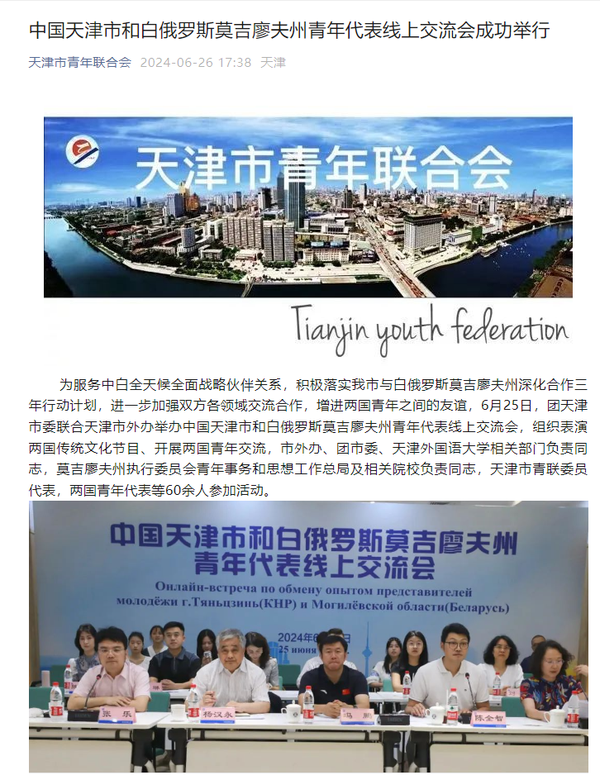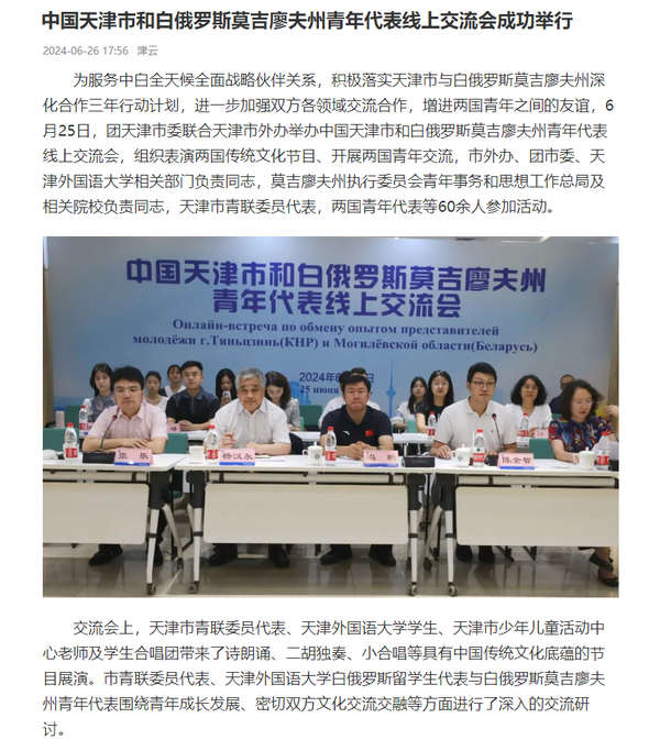 近日,副市长张玲率团应邀访问白俄罗斯莫吉廖夫州,并在当地举办“天津周”系列活动。其中,6月25日,团天津市委联合天津市外办举办的中国天津市和白俄罗斯莫吉廖夫州青年代表线上交流会在天外举行。6月26日,开云链接官网与白俄罗斯莫吉廖夫国立大学联合主办“天津市—莫吉廖夫州教育合作论坛”。本次活动为莫吉廖夫州当地人民打开了一扇走近天津、感受天津的大门,受到莫吉廖夫州执行委员会、莫吉廖夫国立大学官方网站,莫吉廖夫州地区发展通讯社,津云、北方网、天下之津、津彩青春、天津市青年联合会微信公众号等多家中外媒体对此进行了报道。