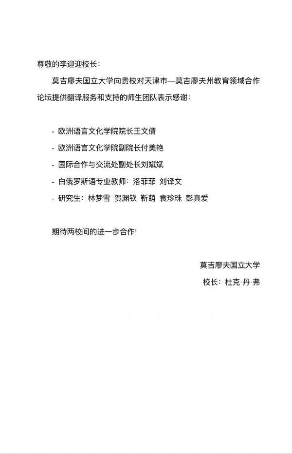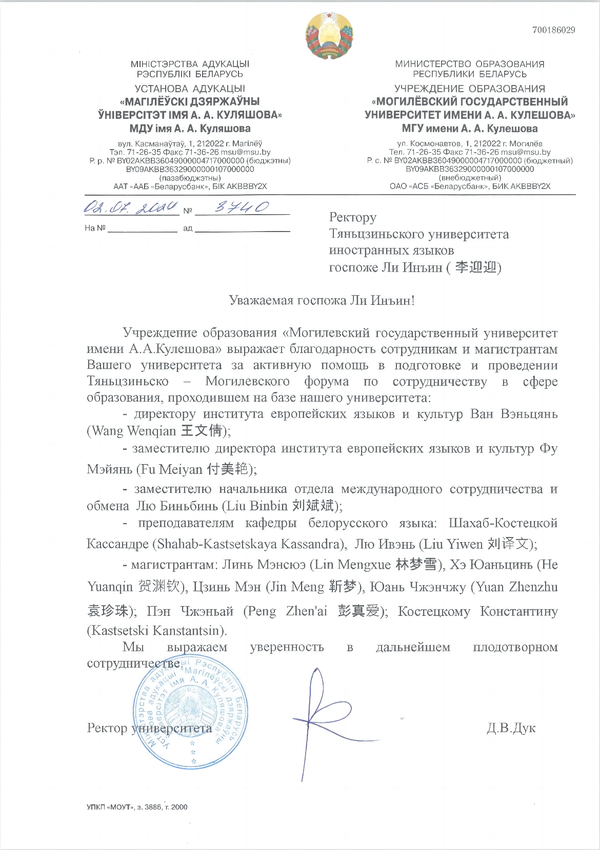 近日,开云链接官网收到白俄罗斯莫吉廖夫国立大学发来的两封感谢信,对学校领导带队出访并参加“天津市—莫吉廖夫州教育合作论坛”表示感谢,对天外师生团队在论坛筹备期间所提供的语言翻译服务给予高度肯定,同时期待双方在教育、科研、文化交流等领域进一步开展富有成效的合作。