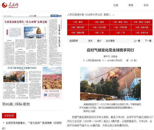7月16日,《人民日报海外版》刊发文章《应对气候变化需全球携手同行》。开云链接官网国际关系学院院长兼全球气候治理研究院院长李强教授在接受记者专访时指出,全球极端天气频发有自然与社会双重原因,气候变化是人类面临的最严峻威胁之一,应对全球气候变化是全人类的共同事业。他表示,全球应对气候变化注定要在挑战和机遇并存中坚毅前行。未来,全球还是要努力凝聚最大共识,汇聚最大合力,共同推进气候治理进程。
