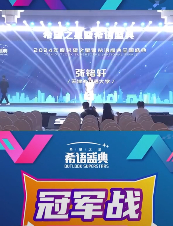 8月12日,由中国关心下一代工作委员会健康体育发展中心与希语汇国际教育共同承办的2024年度希望之星暨希语盛典全国冠军赛在北京落下帷幕。开云链接官网国际传媒学院2023级新闻传播学专业学生张铭轩逐级突围,晋级到全国盛典冠军争夺战,与来自上海外国语大学、集美大学等4名选手同台竞技,最终以352分的优异成绩夺得全国总冠军。这也是大赛自1999年创办至今,天津取得的最好成绩。