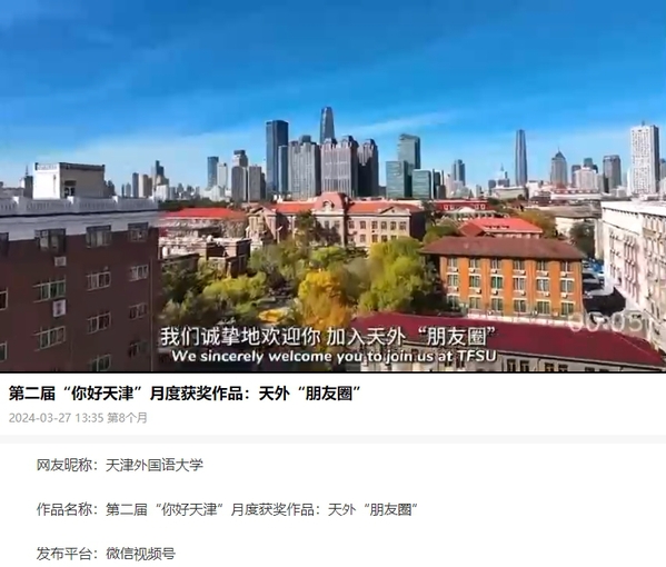 《天外“朋友圈”》由校党委宣传部制作,展示了坐落于万国建筑云集的五大道风景区的天外马场道校区,以及湖光山色、风景秀丽的滨海校区,呈现出学校名家荟萃、思想争鸣的学术文化氛围,重点突出了天外在积极投身国家国际传播能力建设方面取得的成绩。目前,天外已与40多个国家和地区的300余所高校,展开多种形式的交流与合作,每年接收来自世界60多个国家和地区的2000余名长短期留学生来校学习。诚挚地欢迎大家,加入天外“朋友圈”!