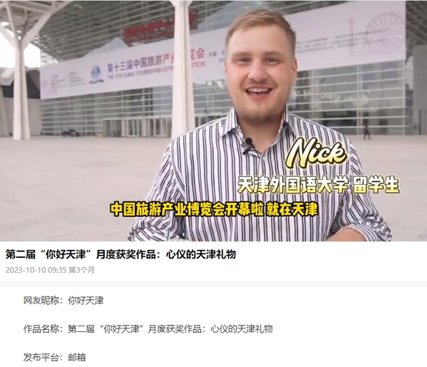 《心仪的天津礼物》由天外国际教育学院留学生尼基塔参与录制,讲述了在中国旅游产业博览会上体验天津文旅项目的经历,助推天津文旅项目的国际传播。