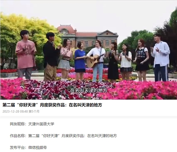 《在名叫天津的地方》是由校党委宣传部策划制作,学校意大利语专业外籍教师作曲,天外学生记者团同学填词,中外倾情献唱的网络原创歌曲。词曲及MV创作灵感来源于诗句“明月何曾是两乡”,分别在校园、五大道、海河沿岸、意大利风情区等地取景拍摄,展现了天津的中西合璧、开放包容、热情好客,以及中外师生心手相牵,梦圆天津,共同谱写了中意友谊地久天长的美好乐章。