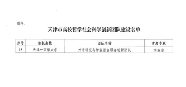 近日,天津市教育委员会发布了《市教委关于启动天津市高校哲学社会科学创新团队建设工作的通知》。经过学校申报、市教委专家组评审及公示等流程,由我校校长李迎迎教授担任首席专家的“外语研究与智能语言服务创新团队”获得建设审批。