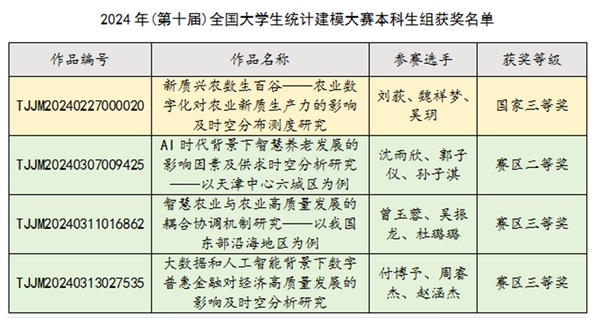 近日,在2024年(第十届)全国大学生统计建模大赛(本科生组)比赛中捷报频传,开云链接官网学生取得国家三等奖1项,天津赛区二等奖1项,天津赛区三等奖2项的好成绩!