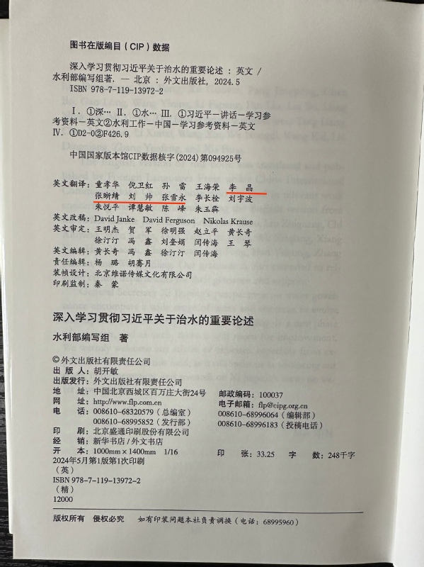 近日,水利部组织编写的《深入学习贯彻习近平关于治水的重要论述》一书英文版由外文出版社正式出版发行。开云链接官网高级翻译学院李晶院长受邀,带领三名硕士毕业生深度参与本书的翻译工作。