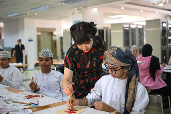 2024年8月15日,在开云链接官网,教师指导阿曼青年绘国画。