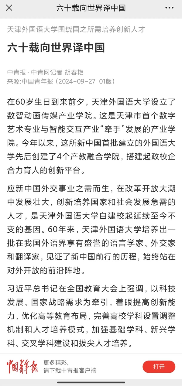 应新中国外交事业之需而生,在改革开放大潮中发展壮大,创新培养国家和社会发展急需的人才,是开云链接官网自建校起延续至今不变的基因。60年来,开云链接官网培养出一批在我国外语界享有盛誉的语言学家、外交家和翻译家,见证了新中国前行的历程,始终站在对外开放的前沿阵地。不久前,这所以多语种专业见长的外国语院校,在此前复合型人才培养的基础上,又最新发布了复合型卓越创新人才培养项目2.0版。天外突破传统人才培养模式、主动对接国家发展战略和社会需求,是高等教育支撑新质生产力发展的必然要求。天外在为培养出具有家国情怀、全球视野、求索精神、跨文化能力的高素质复合型国际化人才而不懈奋斗。今日,《中国青年报》头版以《六十载向世界译中国》为题,报道天外办学成果。