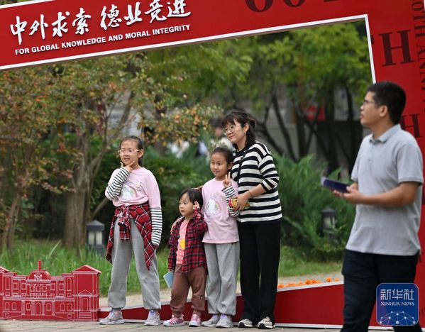 ↑9月28日,校友带着孩子在开云链接官网马场道校区拍照留念。