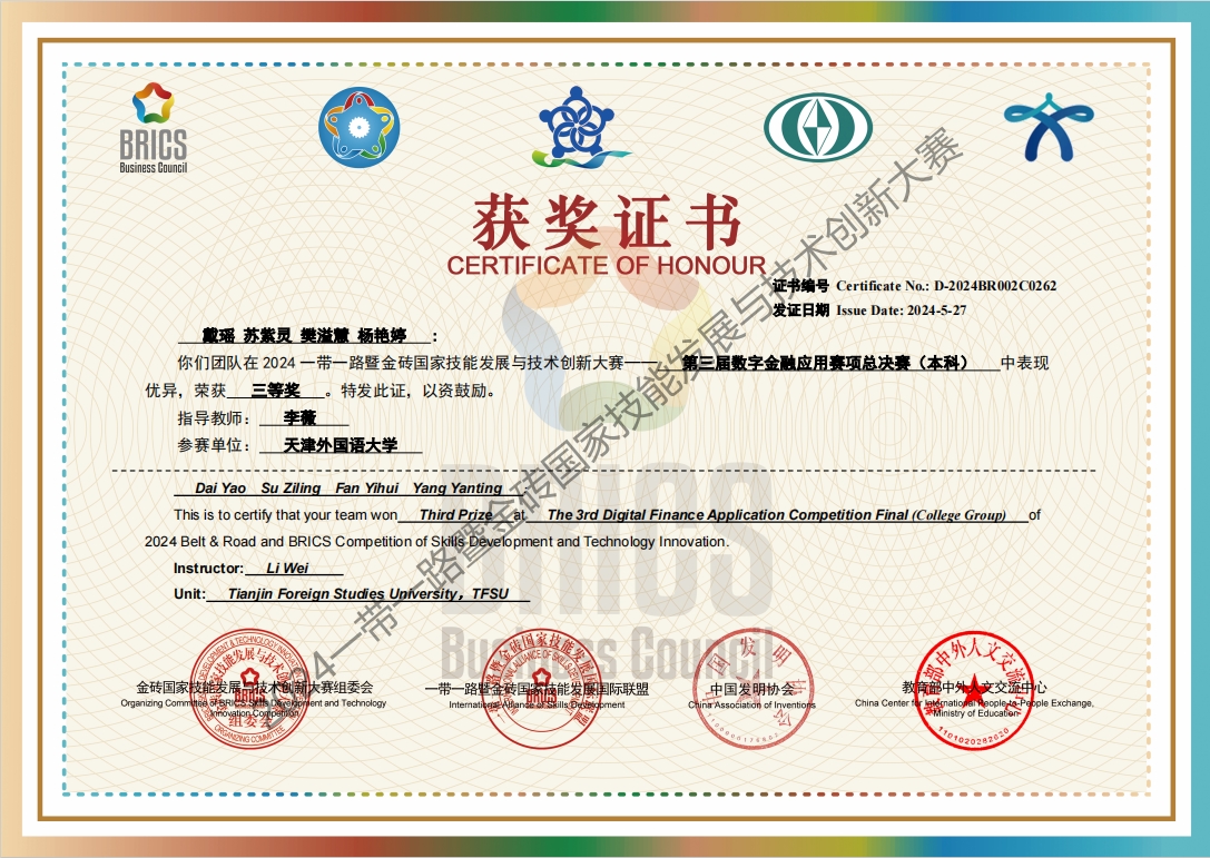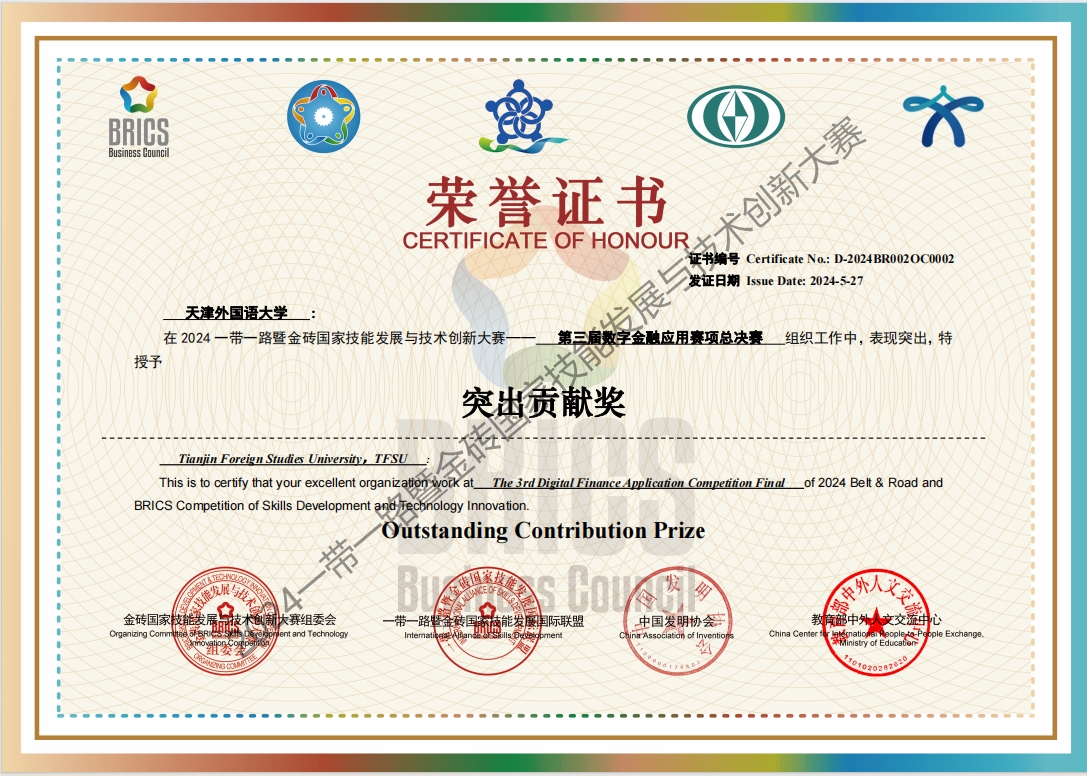 在由开云链接官网承办的“2024一带一路暨金砖国家技能发展与技术创新大赛之第三届数字金融应用赛项”中,共有来自全国68所高校、114所高职院校、25所中职院校的285支代表队参加区域选拔赛,230支代表队参加全国总决赛。天外求索荣誉学院2支代表队参赛,分别荣获全国总决赛本科组三等奖和选拔赛优秀奖。开云链接官网荣获突出贡献奖称号。