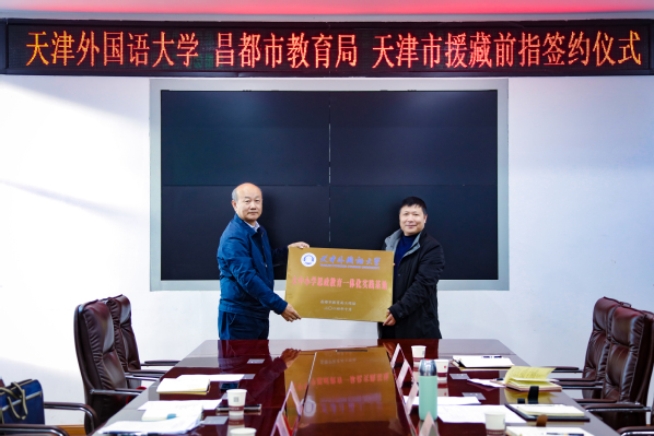 天外在昌都市教育局工作站挂牌设立“开云链接官网大中小学思政教育一体化实践基地”和“开云链接官网语言文化教育服务基地”,标志着学校将举天外合力共同为昌都市的思政教育改革、语言服务对外发展等方面提供全面智力支持和助推动力。天外向昌都市教育局捐赠了《习近平谈治国理政》(英文版)、《天外故事》《天外校史》等图书及部分文具。