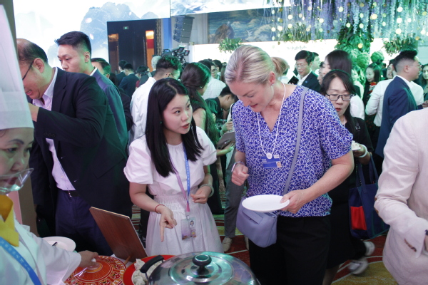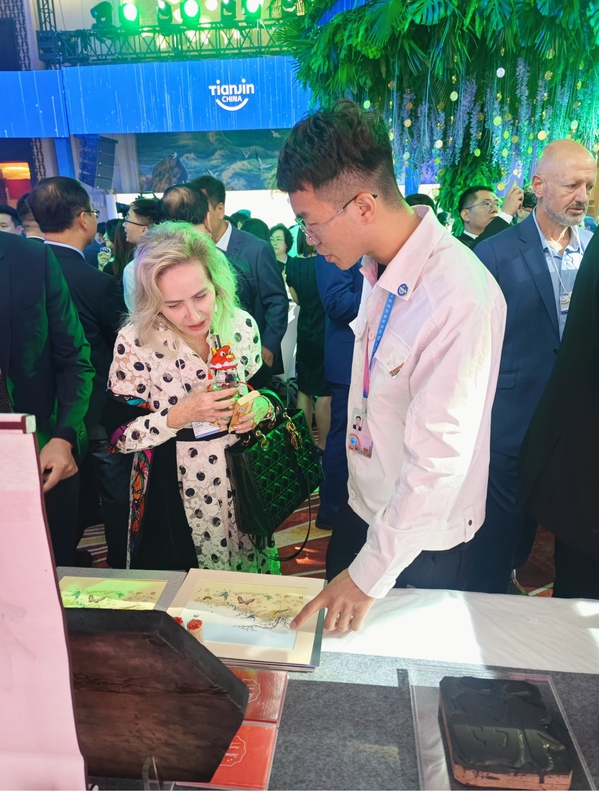 学生志愿者在“天津之夜”活动中为外宾介绍天津小吃和非遗文化