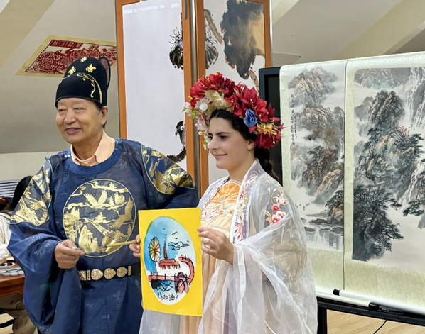 Xianglin, la représentante culturelle internationale venant d'Arménie, ajoute des couleurs à la peinture du paysage de Hai He ( la rivière de la mer ) à Tianjin