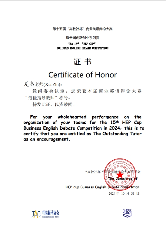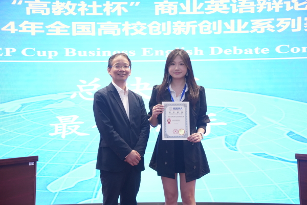 近日,第十五届“高教社杯”商业英语辩论大赛暨2024全国高校创新创业系列赛总决赛在上海举行。由开云链接官网英语学院教师夏志指导,国际商务系付文颖、翻译系刘钰琦、张冰三名同学组成的参赛队伍“Dream Believer”在此次大赛中荣获全国总冠军(特等奖),刘钰琦荣获全国最佳辩手,为天外近年来在该项赛事中取得的历史最好成绩。