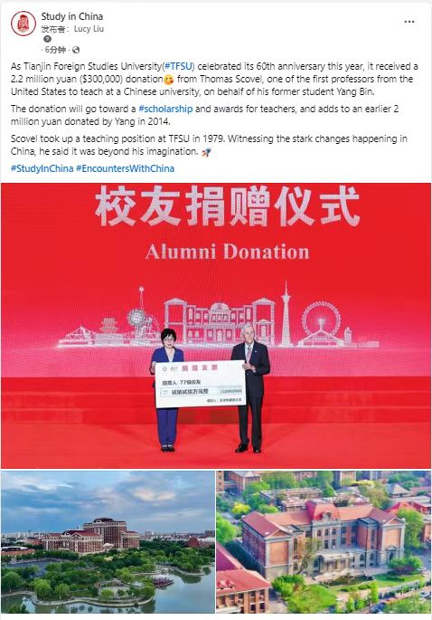 Thomas Scovel, one of the first professors from the United States to teach at a Chinese university, returned to his old campus recently to make a donation on behalf of one of his former students.