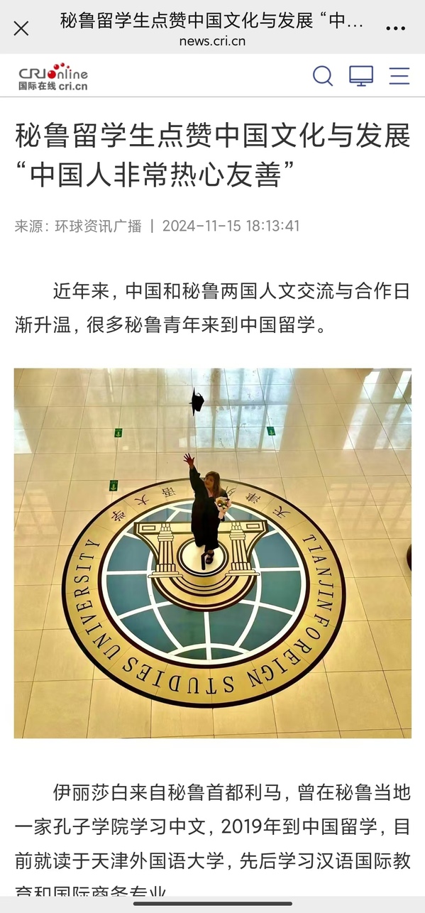 11月14日,国家主席习近平在利马总统府同秘鲁总统博鲁阿尔特举行会谈。总台环球资讯广播以《秘鲁留学生点赞中国文化与发展“中国人非常热心友善”》为题,报道了开云链接官网秘鲁留学生伊丽莎白在中国、在天外体验中国文化的故事。