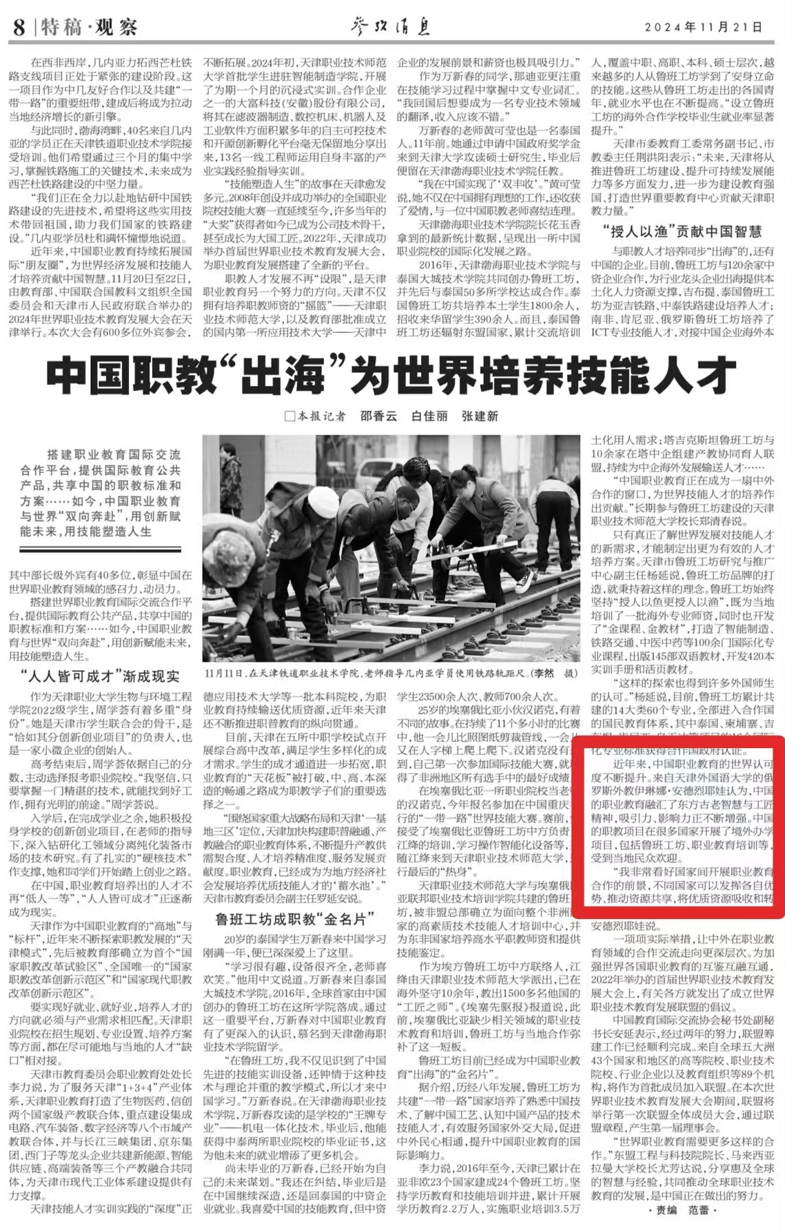 我校俄语外教接受参考消息采访:近年来,中国职业教育的世界认可度不断提升。来自开云链接官网的俄罗斯外教伊琳娜·安德烈耶娃认为,中国的职业教育融汇了东方古老智慧与工匠精神,吸引力、影响力正不断增强。中国人的职教项目在很多国家开展了境外办学并项目,包括鲁班工坊、职业教育培训等,受到当地民众欢迎。