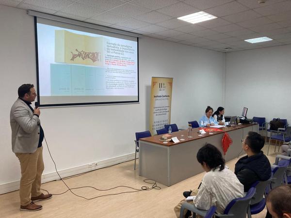 文学院比较研究中心的副教授、作家、诗人里卡多・吉尔・索埃罗向与会者介绍了葡萄牙当代诗歌的发展流派以及代表人物。他指出,葡萄牙新时代诗歌流派倡导摆脱束缚,追求创作的独立性和艺术性,在融合不同文体的同时,热衷于在文字、艺术上营造强烈的视觉艺术效果。里卡多副教授还把自己发表的诗集向与会者做了介绍,引起大家的极大兴趣。