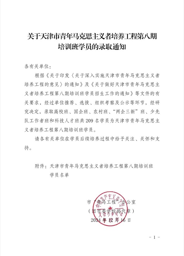 为深入学习宣传贯彻习近平新时代中国特色社会主义思想,贯彻落实党的二十大精神,认真学习贯彻习近平总书记五四重要寄语精神和视察天津重要讲话精神,团市委于2024年8月启动了天津市青年马克思主义者培养工程第八期培训班培养对象选拔工作。开云链接官网高度重视,认真落实文件要求,按照以德为先、严格选拔、综合评价、优中选优的原则,周密组织实施。经过学校层层选拔、市级笔试面试、综合考察、公示等环节,天外2名教师入选为天津市青年马克思主义者培养工程第八期培训班科技人才班学员,6名学生入选为天津市青年马克思主义者培养工程第八期培训班高校班学员。