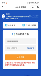 第一步,进入微信‘天外校园卡’小程序,点击右下角应用‘开通企微’按钮(下图左)