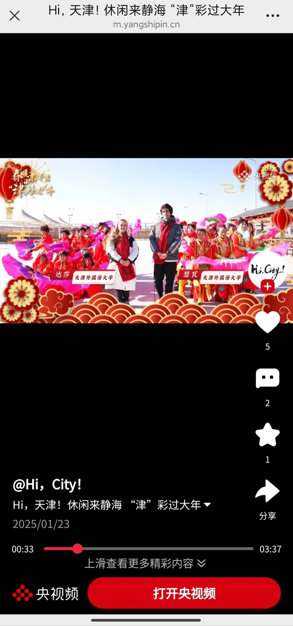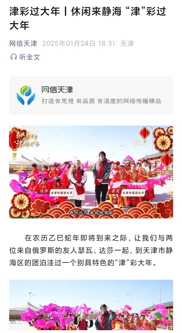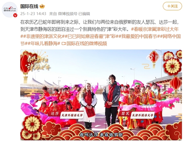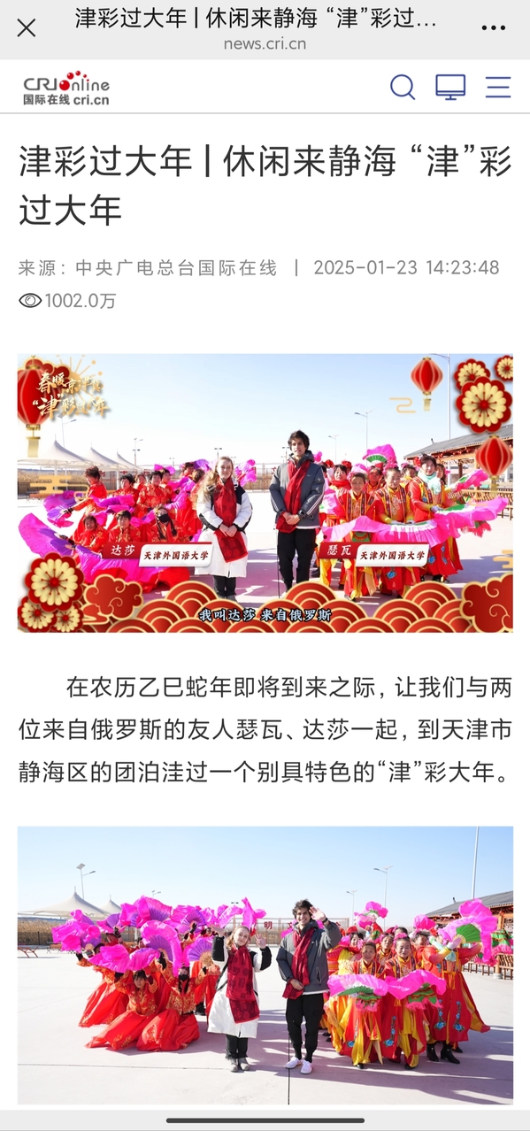 近日,中央广播电视总台国际在线分别以“寻美杨柳青古镇 感悟 ‘津’派文化魅力”“休闲来静海 ‘津’彩过大年”为题,报道了天外留学生“津彩过大年”的故事,相关报道在央视频、国际在线微博、网信天津微信公众号上转发,累计点击量超1000万。