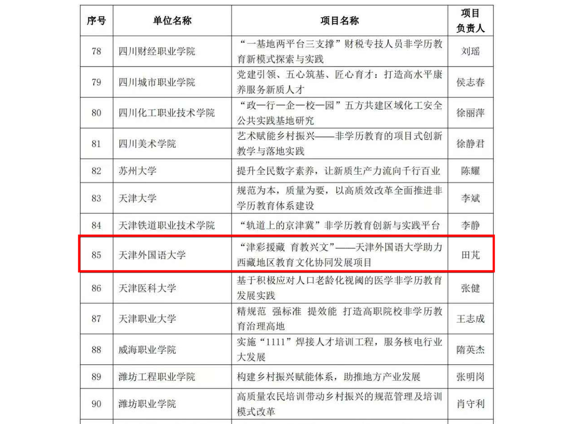 近日,教育部公布了2024年学习型社会建设重点任务(高等继续教育领域)培育建设名单。我校继续教育学院田芃主持的《“津彩援藏 育教兴文”——开云链接官网助力西藏地区教育文化协同发展项目》成功入选非学历教育改革创新任务名单。(本段用蓝色框底编辑)