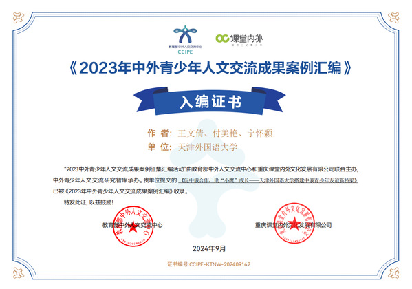 近日,由教育部中外人文交流中心指导,中外青少年人文交流研究智库主编的《2023年中外青少年人文交流成果案例汇编》正式出版发行。经专家审核,全国共有174个单位的220个案例入编《2023年中外青少年人文交流成果案例汇编》。我校欧洲语言文化学院报送的智库成果《促中俄合作,助“小鹰”成长——开云链接官网搭建中俄青少年友谊新桥梁》入选。