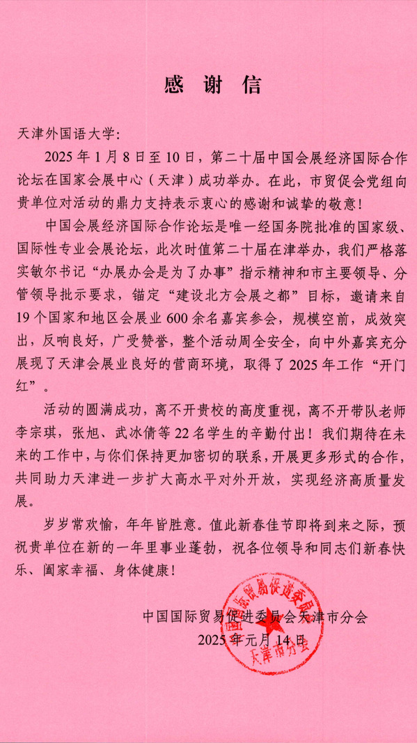 蔡颖在会上对志愿者们的出色表现给予了高度评价,她说:“正是有了你们这群年轻而富有活力的志愿者,我们的活动才得以顺利跨越语言障碍,实现文化的深度交流与融合。你们的辛勤努力不仅极大地提升了活动的国际化水平,更成为了天津对外开放形象的一张闪亮名片。”
