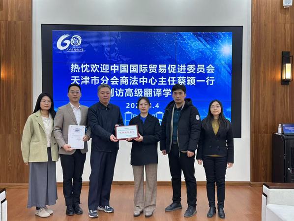 近日,中国国际贸易促进委员会天津市分会商法中心主任蔡颖一行到访我校,并发来感谢信,感谢学校对“第二十届中国会展经济国际合作论坛”的鼎力支持。高级翻译学院党委书记郭芃及相关负责同志出席了会议。