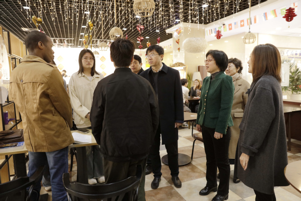 汤富强一行首先来到国际交流中心外国专家书屋,实地考察书屋的设施与环境,并与在场的外籍专家、学生亲切交流。汤富强详细询问了外国专家在书屋的使用体验,鼓励他们充分利用这一便利设施,进一步融入天津社会生活,促进中外文化的深度融合。在随后的座谈中,汤富强指出,天外的外国专家工作成效显著,这充分彰显了学校对此项工作的重视程度,外国专家书屋设施完善,环境优美,为专家们在津安心工作提供了良好的保障。