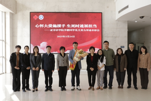 “学习急救知识,关键时刻真的能救命!”3月24日上午,我校在逸夫楼大江厅召开李懋同学见义勇为事迹表彰会,对在南京街头“黄金4分钟”开展生死救援的亚非语学院李懋同学进行表彰。校党委书记周红蕾、校长李迎迎、校党委副书记胡志刚、天津市红十字会基层建设部副部长孙彦丽、天津市红十字会赈济救护部一级主任科员于博出席,相关职能处室、学院领导、专业老师、辅导员老师、同学和校红十字会志愿者代表参加会议。