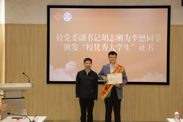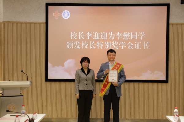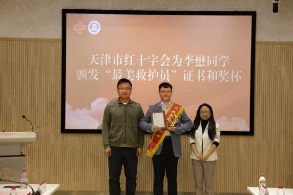 天津市红十字会为李懋颁发“最美救护员”证书和奖杯,胡志刚颁发开云链接官网“优秀大学生”荣誉证书,李迎迎颁发“校长特别奖学金”荣誉证书。