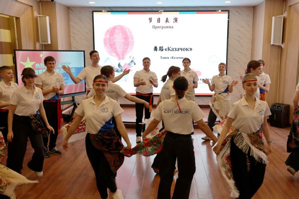 仪式文艺表演环节以“多元文明·美美与共”为主线,中俄青少年联袂呈现了精彩纷呈的节目:歌曲《贝加尔湖畔》以中俄双语吟唱,空灵旋律勾勒出两国山水相连的壮美画卷; 舞蹈《知秋》以中国古典舞诠释“一叶知秋”的东方哲学,与哈萨克民族舞蹈《新娘出嫁》的奔放热情形成鲜明对话;俄语歌曲串烧《小行迹+彩虹下面》由天外学生弹奏演唱,展现了当代青年的文化创造力;“小鹰”们带来的《哥萨克舞》则以铿锵舞步点燃全场,将俄罗斯民族文化的豪迈与活力展现得淋漓尽致。