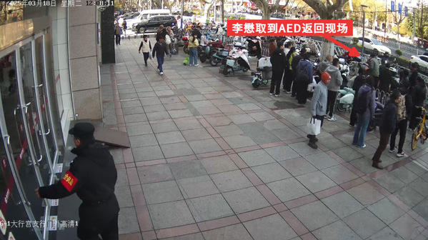 12时09分,李懋拿AED返回后,鲁芋甫、李懋和杨东宇三人在交替进行心肺复苏的同时,使用AED对倒地男子进行了三次电击。
