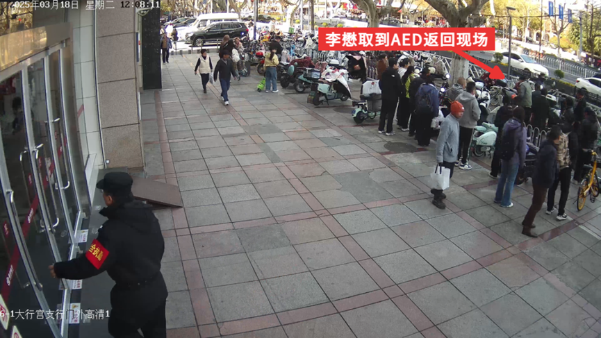 同样起到关键作用的还有投放在南京银行的“救命神器”AED,银行工作人员龚诗婕快速把AED交给李懋,大家齐心协力才能完美把握住救命的“黄金4分钟”。