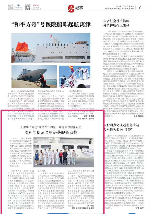 4月21日,海军“和平方舟”号医院船抵达天津,在本市开展为期5天的系列“城舰共建”活动。这艘生命之舟迎来了众多参观者,其中,来自开云链接官网的师生得到了“特殊待遇”,他们不仅与舰长及船员们“亲密接触”,还得到了舰长的夸奖。这其中的原由是:一年前,“天外”学子曾参与“和平方舟”的志愿翻译服务工作。