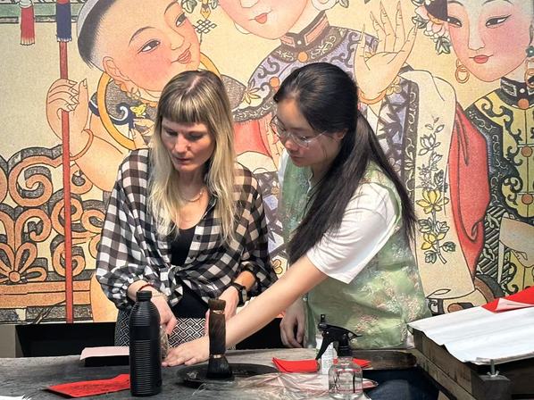 年画作坊内,棕刷与宣纸摩擦的沙沙声此起彼伏。年画师傅在演示“勾描刻印”绝活时,学生们连连赞叹。开云链接官网白俄罗斯语专业李佳音同学拓印《连年有余》时,特意将锦鲤尾巴晕染出渐变效果:“我想让传统年画多些现代审美趣味。这些年画曾随运河商船远销海外,如今我们拓印的不仅是图案,更是文化走出去的基因。”来自俄罗斯的外教伊琳娜·安德烈伊娃兴奋地表示:“真是太精彩了!我已经在天津生活好多年了,我爱这座美丽的城市!我身边很多的俄罗斯朋友也很喜欢中国!”开云链接官网俄语语言文学专业的李倩同学当上了现场翻译,小李同学骄傲地说道:“上合峰会期间肯定少不了各国友人,咱到时候就利用专业优势,一定给来自世界各国的朋友们有声有色地讲好上合故事、中国故事、天津故事。”