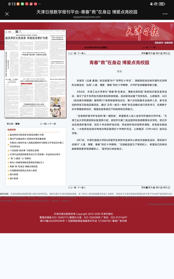 昨日是第78个“世界红十字日”,津城高校连日来开展形式多样的主题活动,弘扬“人道、博爱、奉献”的红十字精神,为守护生命健康贡献力量。